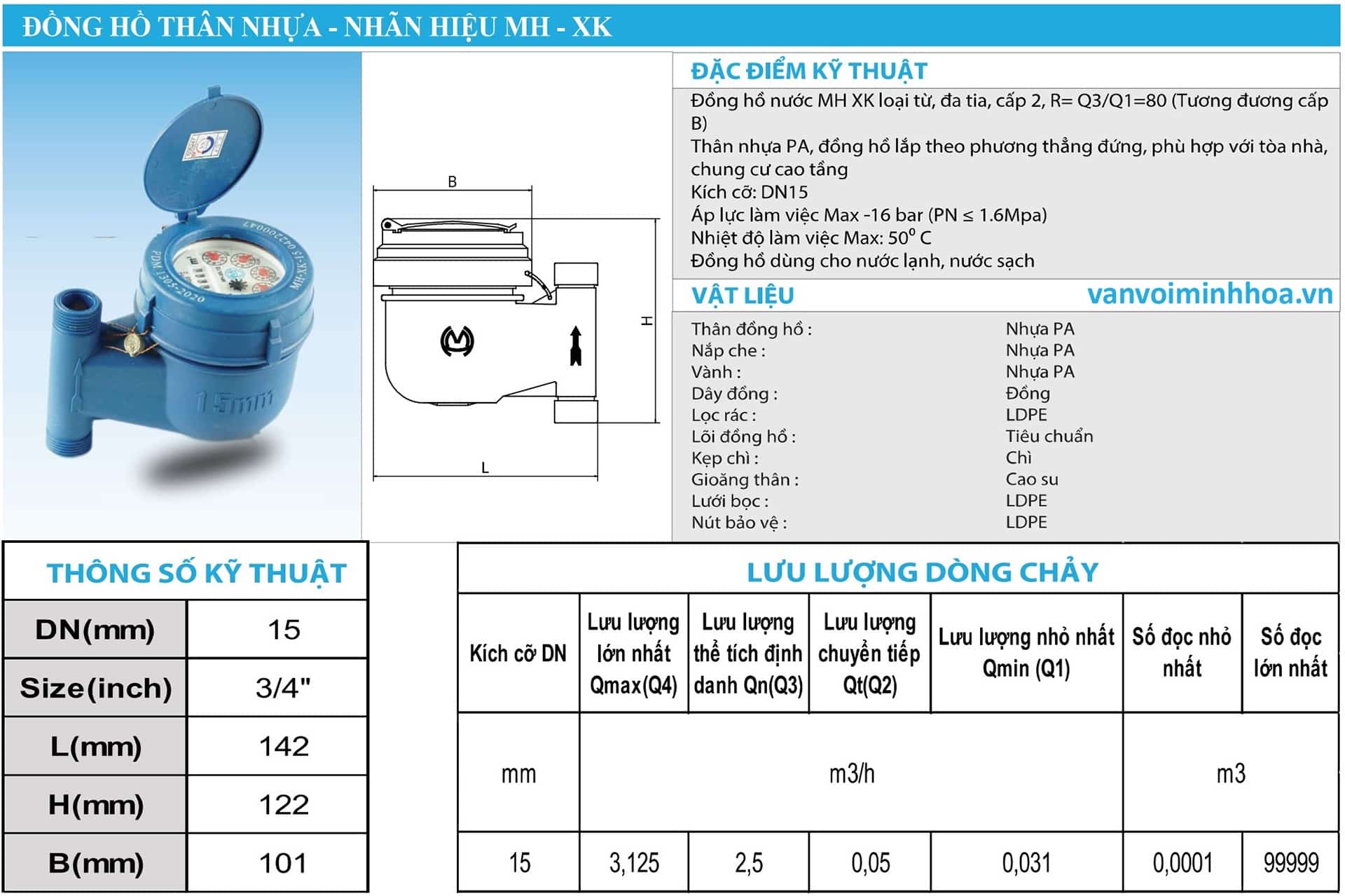 1. Thông số kỹ thuật đồng hồ thân nhựa, loại từ, đa tia, cấp B MHV-XK
