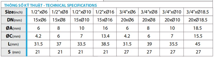 1. Thông số kỹ thuật nối nhanh ống mềm đồng ren ngoài