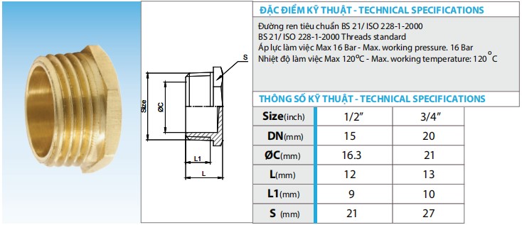 1. Thông số kỹ thuật nút bịt đồng ren ngoài