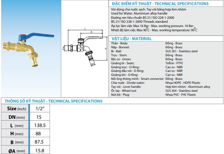 1. Thông số kỹ thuật vòi vườn đồng mạ MIHA-XK