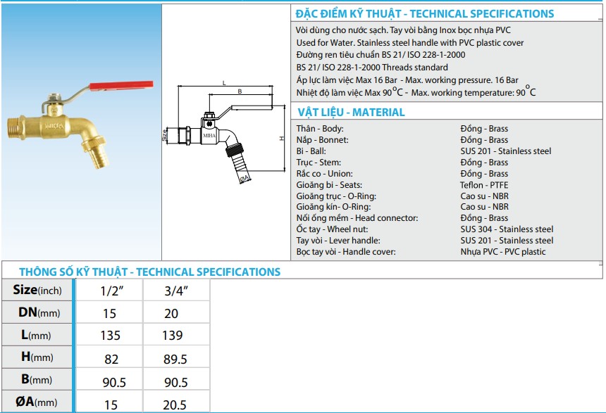 1. Thông số kỹ thuật vòi vườn đồng tay inox MIHA