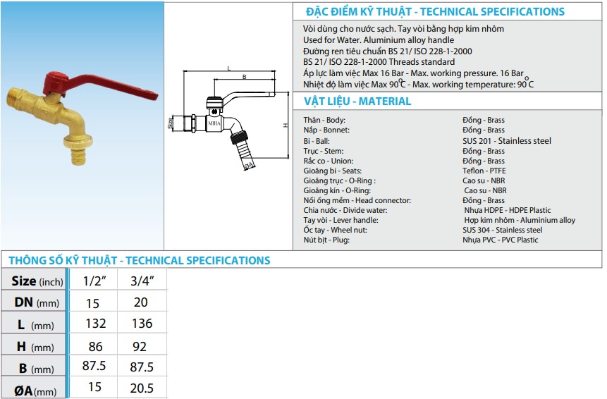 1. Thông số kỹ thuật vòi vườn đồng tay nhôm MIHA